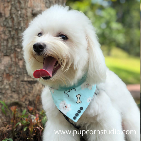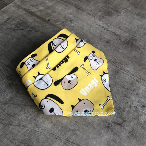 We use high quality premium cotton fabric, custom printed with the design, and make them into bandanas in our Singapore studio. Each piece of fabric is customized for your dog, so it is definitely very special and unique!