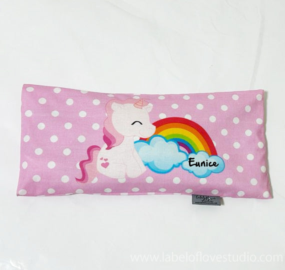 This is a ready stock beansprout pillow (case + insert) in one of our most popular Rainbow Unicorn design, customised with your baby's name. We are able to send out next day of ordering.