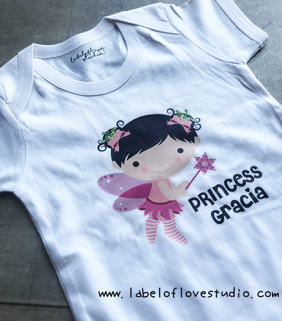 Show off your fairy princess in this royal romper! Choose between pink and red fairy.