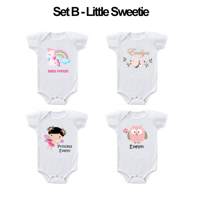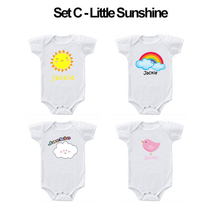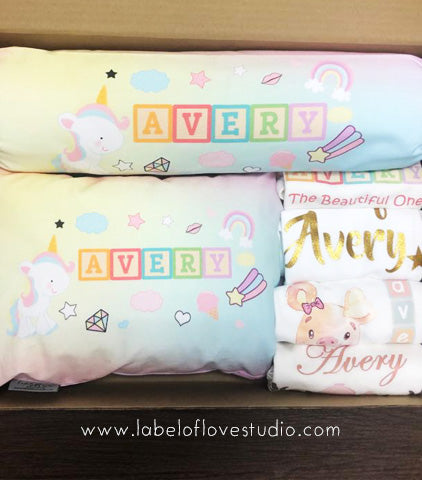 4 beautiful personalized rompers or tees with a personalized pillow/ bolster set, just how sweet is that? Refer to romper/ tee sizes here.