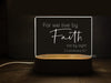 This night light features the biblical verse, 'For we live by faith not by sight' from 2 Corinthians 5:7.