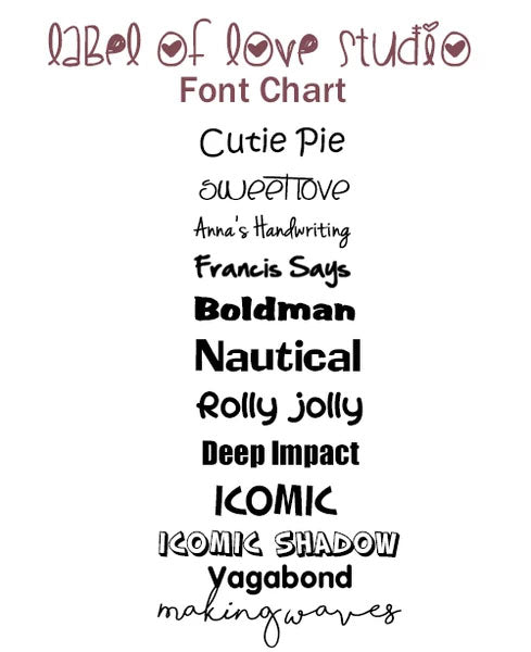 3. 2 pieces of black iron on names (view fonts in last pic, choose fonts from drop down list)